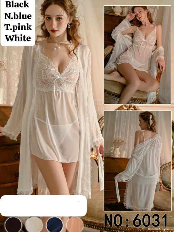 3-piece short lingerie set crafted from soft full net stretchable fabric for a comfortable and flattering fit. This set includes a stylish chemise, matching panty, and an elegant gown.