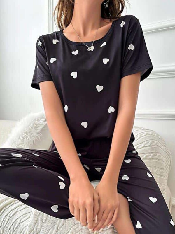 Black and white heart‑print pajama set for women, featuring a soft top and matching pants for comfortable nights and relaxed lounging.