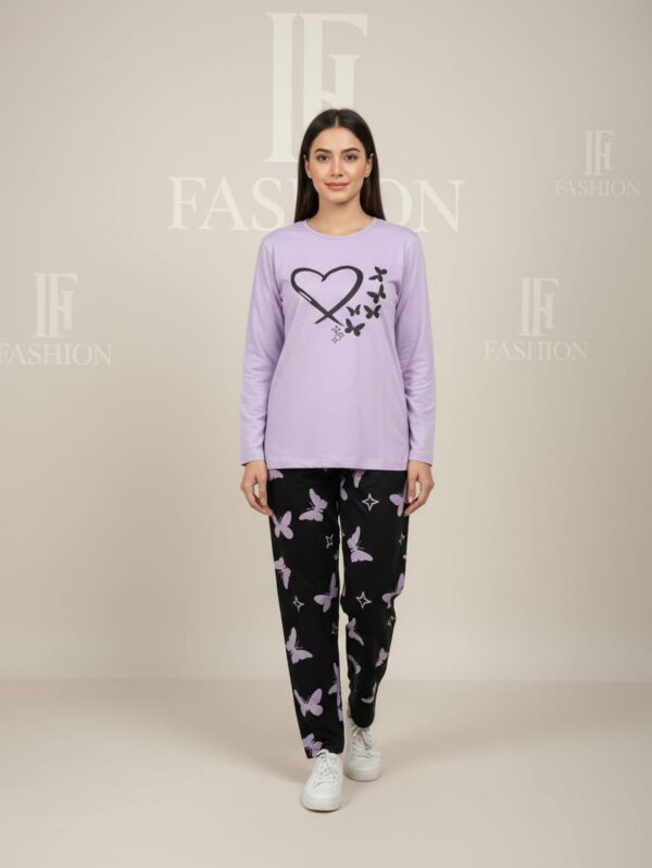 Relax in this Lavender Love Butterfly Pajama Set — a breathable two-piece nightwear with a lavender printed top and butterfly-patterned black trousers for comfort and style.