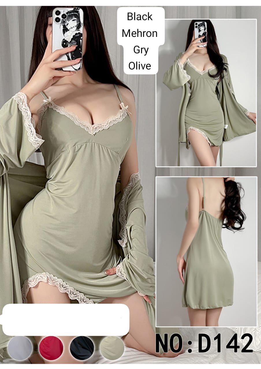 Trendy and stylish 3-piece short lingerie set crafted from soft Malai jersey stretchable fabric, featuring delicate lace borders and chic shoulder strap bands for a modern and attractive look. This set includes a chemise, matching panty, and an elegant gown for a complete and graceful ensemble. Suitable for chest sizes 32 to 40.